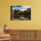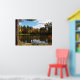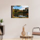 This lovely fine art travel poster features a young woman sitting and dreaming on the dock at the edge of a large pond in New England. Autumn is in the air. The water is surrounded with trees in gorgeous fall foliage colours of yellow, green, red, orange and gold. The blue sky has fluffy white clouds and all this is reflected in the water. The trunk of a large pine tree defines the left side. The brilliant sunshine is reflected in her red hair.