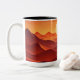 Un aménagement paysager abstrait avec des lignes douces ondulées et des tons chauds sur un ciel de marron foncé. Cette tasse à l'écharpe apporte des ambiances douillettes et rêveuses à votre brasse quotidienne.