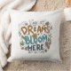 The "Dreams Bloom Here" throw pillow design features a whimsical and serene motif that embodies growth and imagination. The centrepiece is an elegant, hand-lettered phrase "Dreams Bloom Here," surrounded by soft, blooming flowers in pastel hues. The delicate petals are complemented by a subtle, calming background in light tones, evoking a peaceful and inspiring atmosphere. This design is perfect for adding a touch of creativity and tranquillity to any living space, encouraging a sense of hope and possibility.
