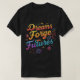 The t-shirt design features the phrase "Dreams Forge Futures" in a bold, multi-coloured font, set against a vibrant backdrop of glowing sparks and gears. The energetic design conveys a sense of determination and ambition, making it a perfect choice for anyone who believes in the power of dreams to shape the future.
