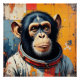 A chimpanzee dressed as an astronaut gazes thoughtfully into space.