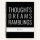 Carnet personnalisé avec grand titre de type surdimensionné de "Thoughts Dreams Ramblings" sur une couverture de journal en noir et blanc avec votre nom et la couleur arrière - plan qui peut être changée à votre préféré.
