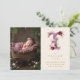 Dreamy Funny Bunny Romantic Floral T Initial in Burgundy & Gold Glitter Effect for Newborn Photo Announcement Card Design.