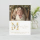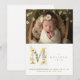 Dreamy Romantic Floral M Initial in Gold Glitter Effect for Newborn Photo Announcement Card Design.