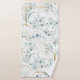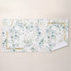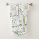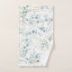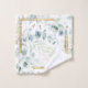 Delicate, foliage arrangements with small flower accents in soft, dreamy shades of green, gold and dusty blue with splashed of glitter and gold, faux-foil corner frames, form the background pattern for this elegant towel set design. See ID817 to see additional products with design, including matching wedding stationery.