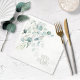 Delicate, nature inspired greenery arrangements including blue gum eucalyptus with splashes of gold and gold leaf outlines along with unique design layouts make this an exciting wedding set for any time of year. The wedding paper napkin shown here features a lush foliage corner border surrounding the bride and groom's names and wedding date. View the collection link on this page to see all of the matching items in this beautiful design or search ID817 to see other pieces and color choices for this set.