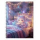 Adorable kawaii spiral notebook featuring a dreamy pastel bedroom scene with warm fairy lights, soft blankets, cute room decor, and a fluffy glowing kitten reading a book. Perfect for journalling, notes, school, writing, and kawaii stationery lovers. A magical and cozy notebook design full of charm, softness, and dreamy details.