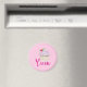 A magnet with a yummy pink cupcake with scrumptious swirls of pink frosting with a yellow cupcake holder. A raspberry with stem and leaves on top. Dreamy and delicious. Text says Yum in a fancy trendy font. Set on a pastel pink backdrop.