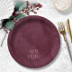 Delicate, foliage arrangements with small flower accents in soft, dreamy shades of cream, taupe and rose with splashes of burgundy glitter and unique design layouts make this an exciting collection, especially for autumn weddings. The coordinating wedding paper plate shown here features a deep burgundy, watercolor texture with waves of soft rose. Add your names and wedding date using the provided template. View the collection link on this page to see all of the matching items in this beautiful design or search ID817 to see other pieces and color choices for this set.