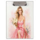 A beautiful woman in a flowing pink dress holds a bouquet of flowers and a pair of high heels in this elegant watercolor illustration.