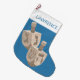 A lovely addition for interfaith families, these personalized Hanukkah themed Christmas stockings bring in the Festival of Lights to your holidays. Each custom stocking is printed with a rich medium dark blue background, a pair of rustic oak look dreidels, a white cuff area at the top and a simple blue font where you can add the child's name. Cute for both kids and adults, these Chrismukkah stockings with simple dreidel images and your personalization are a great way of blending holidays for everyone. Merry Happy Everything!