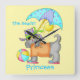 Let this dog tell time with this whimsy wall clock featuring dog art and a customized name or dog name. Great gift idea. This cute grey (grey) dog is ready for fun time at the beach with a colourful beach ball and a turquoise and lavender beach umbrella. Wearing cool yellow sunglasses, fuchsia and turquoise flip flops, orange beach tee shirt and a purple and green beach hat, she's ready to go, dressed in style. The background is yellow. Fully customizable for a name to personalize and customizable words "The Beach" can be changed to other words of your choice. The sun is out and shinning for a perfect day and she or he is ready for you to toss the ball. The dog breed fits with terrior or other small grey dogs with medium to long hair. This design is cute for all dog lovers and is original art by artist and fabric designer Phyllis Dobbs. Fully customizable.
