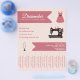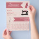 A dressmaker flyer with tear off strips and illustration of a sewing machine, a sewing mannequin, and a dress with sewing pins on a light pink background. Perfect for activities such as dressmaker, alterations, repairs, fashion designer, tailor, handmade sewing, etc.
