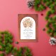 Tropical dried palm leaves, pampas grass and protea flowers real gold foil arch real gold foil wedding invitation. This lovely wedding design features a gold foil arch frame on terracotta stained background. In the frame there is a bouquet of dried palm leaves, protea flowers and pampas grass.