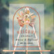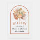 Design a beautiful translucent frosted acrylic wedding welcome sign that features a tropical flair by adding dried palm leaves, pampas grass, and protea flowers in lovely terracotta pink and beige tones. The arch frame, in terracotta colour, perfectly enhances the lively hues of the botanical accents. This distinctive blend of textures and colours will undoubtedly serve as a stunning focal point for any wedding celebration.