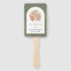 Tropical dried palm leaves, pampas grass and protea flowers green arch botanical wedding hand fan program. This pretty wedding design features an arch frame on green stained background. In the frame there is a bouquet of dried palm leaves, protea flowers and pampas grass.