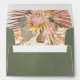 Tropical dried palm leaves, pampas grass and protea flowers sage green fall wedding envelope. This lovely wedding design features a green pink coloured stained background on the outside. The inside includes a bouquet of dried palm leaves, protea flowers and pampas grass.