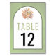 Tropical dried palm leaves, pampas grass and protea flowers sage green arch wedding table number. This lovely wedding design features an arch frame on green stained background. In the frame there is a bouquet of dried palm leaves, protea flowers and pampas grass.