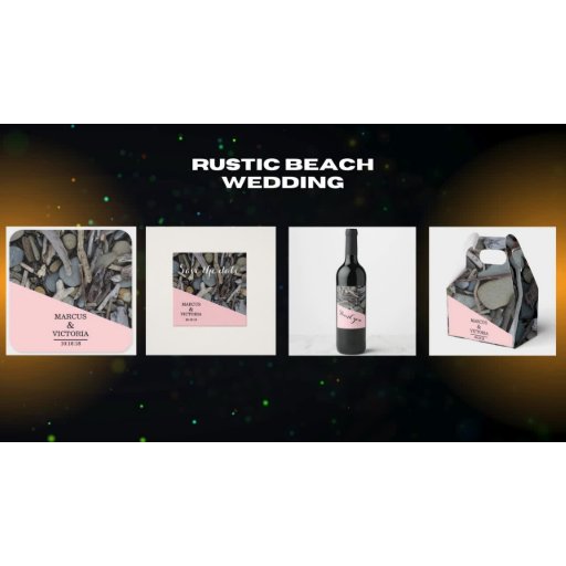 A save the date design that can be customized with the bride and grooms names. The background is a collage of a pink banner and a photo of beach stones and driftwood.