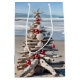 Driftwood Christmas tree with seashells and starfish on an ocean beach.