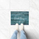 Modern, chic brush script reading WELCOME TO OUR BEACH HOUSE in a trendy typography driven design. Great custom beach house decor for your home away from home. Both romantic and stylish, our turquoise printed driftwood door mat features a sweet shell illustration between your location and the year established.