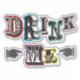 Custom-cut vinyl sticker with an image of the phrase “Drink Me” in colourful, old-timey block lettering and two hands, each with a finger pointing at the word “Me.” See matching oval sticker and favour tag. See the entire Wonderland Sticker collection in the INVITES | Stickers & Labels section.
