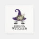 The ideal napkins for your Halloween party or Halloween-themed bachelorette party. It features a cute witch face (a purple witch's hat with a white and gold bouquet over a pair of arched eyebrows and eyelids made up with silver glitter). Below, the black text reads "Drink up, witches!" in a suitably creepy font.