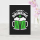 This card features two stylized beer mugs on a deep black background, tilted toward each other like close friends clinking in mid-cheer. Each mug is filled with shamrock-green beer 💚 and capped with thick, cloudlike white foam that spills up in rounded shapes. The mugs are outlined in white, giving them a crisp edge while keeping the scene simple and easy to read. Across the top, the words “TODAY DRINKING” sit in all-caps white lettering, arched so it frames the image like a banner. Between the two words, a small green three-leaf shamrock ☘️ is centered above the mugs, acting like a tiny meeting point that ties them together. The tight spacing and mirrored angles of the mugs create a cozy, together-at-the-bar feel, as if the pair is sharing a laugh without needing to look away. The green liquid, white foam, and white outlines stand out sharply against the black field, and the shamrock sits neatly above the rims, centered under the arched text.