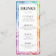 Introducing the slim drink menu card from the "Ethereal Bloom Collection," a vibrant and artistic addition to your wedding reception. At the top of the card, against a backdrop of mesmerizing alcohol ink artwork with swirling hues of blues, purples, reds, oranges, and greens, the caption "Drinks" is elegantly displayed. The couple's names and the wedding date are featured prominently, adding a personal touch to the design.