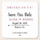 Simple rustic casual Drinks on us! typography script, name, date, and place personalized wedding save the date coaster with dark red burgundy accents.