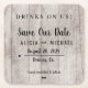 Simple rustic casual Drinks on us! black typography script, name, date, and place personalized wedding save the date coaster on a natur barn wood with string lights background.