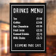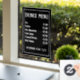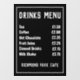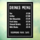 For window mounting - a drinks price-list window cling for a cafe offering beverages. Alter prices as you wish. Displays up to 6 items and prices. Black and white.