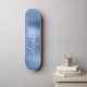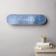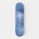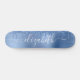 Custom girly skateboard featuring blue faux glitter dripping against a blue faux metallic foil background. Personalize with your name in a stylish trendy white script with swashes.