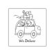 A moving cartoon car with a big-nosed driver in a baseball hat, a happy dog in the back seat, and a bunch of boxes and a cactus on its roof.