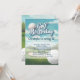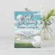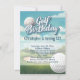 Share details of your fun driving range or golf birthday party for a teen boy, teenager or adult, or other golf themed event. Festive golf course graphic with sand trap and green grass, scenery and ball. Great event invitation for a driving range, mini golf centre or just a golf themed celebration.