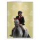Drôle chien boxer habillé comme un cheval à cheval présentant du jockey sur un cheval gris avec des oreilles de diable pointu rouge sur un arrière - plan vintage damassé jaune doré traditionnel. Pour des produits assortis et des animaux plus fous habillés comme les gens visitent le VINTAGEPRINTSTORE. Design copyright Oconnart.