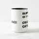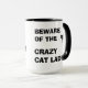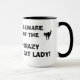 Une tasse humoristique poussant un peu d'amusement aux amoureux de les chats. Cette tasse orientée noire et blanche de sonnerie comporte un chat effrayé et le texte "prennent garde de la dame folle de chat" du côté droit. La gauche comporte le mot "avertissant !".