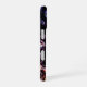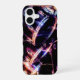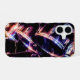 The image on this iPhone 16 Case is an original photograph by ZoeSPEAK of a drum set. The shiny black drums with their silvery rims reflect the colours of the lights in the studio, blues, reds and greens.