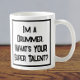 Drôle slogan sur une tasse de café qui dit "Je suis un batteur. Quel est VOTRE super talent ?" Café Mug pour batteur. Texte en gras noir et blanc.