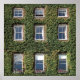 The centerpiece of this poster is the frontage of an elegant Georgian period town house in Dublin Ireland, three stories high, with tall white sash windows completely surrounded by climbing ivy in hues of yellow and green. The large 2 pane windows at first floor level have small decorative wrought iron balconies enclosing red flowering plants.