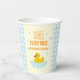 One lucky duck! First birthday featuring a rubber duck and bubbles against a light blue gingham and pale yellow background with orange text