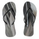 A photo of duck feathers adorns this pair of flip flop creating vertical stripes of feathers. The black and grey bird feathers add a touch of nature and a unique abstract element to these modern flip flops perfect for the beach, summer picnics, or errands around town.