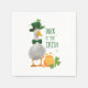 A cute St. Patrick's Day design featuring a lucky duck with a green Irish hat and bow tie beside a pot of gold with shamrocks.