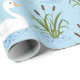 White ducks on a pond surrounded by bulrushes on a slightly patterned background.