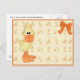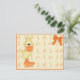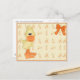 A cute little yellow duck on a pale yellow background. The background has lots of little ducks in various poses and a pretty orange bow in the top right corner.