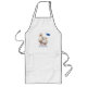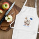 Long bib apron with two white ducks design. Customize blue text beneath the design. Little blue hearts are also part of the image on aprons that come in three styles / sizes and colours. They have pockets and an adjustable neck strap.