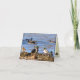 This thank you card features an artistic rendering of a line of Mallard Ducks perched on the shore of Cayuga Lake watching Canada Geese swimming in the blue choppy water. One brave female duck has joined the geese. The male ducks can be identified by their iridescent green heads and yellow beaks. The females have lovely feathers in shades of brown and gold and orange beaks. Long black necks with one white stripe identify the geese. Three more ducks are sitting inside the card. The text can be personalized to suit your needs.