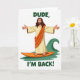This card features a cartoon-style spiritual figure with flowing brown hair, a trimmed beard, and a gentle smile, dressed in a cream tunic with an orange sash. Centered on the front, he stands with arms outstretched as if greeting a friend, riding an orange surfboard across an emerald-green wave 🐇. The warm cream and orange tones contrast with the cool green water and a bright white background, giving the scene a crisp, modern look. The figure’s relaxed posture and kind expression add a friendly, companionable feel, like an inside joke shared between close pals 🌷. At the top, the word “DUDE,” appears in dark green uppercase letters, spaced above the character. Near the bottom, “I’M BACK!” is set in matching dark green uppercase text, anchored beneath the surfboard and wave. The wave curls in a simplified shape with white foam accents, framing the board against the open white space.