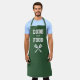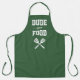The perfect apron for the guy who loves to grill. Two crossed spatulas appear silhouetted in white under the words "Dude with the Food" in white on a hunter green background. Makes an ideal birthday or Father's Day gift.