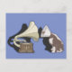 A dog with a scratch-cone howling at an antique gramophone record player with a brass funnel horn. Colour, shadows for nice, 3-d effect, on t-shirts, posters, cards, gifts.